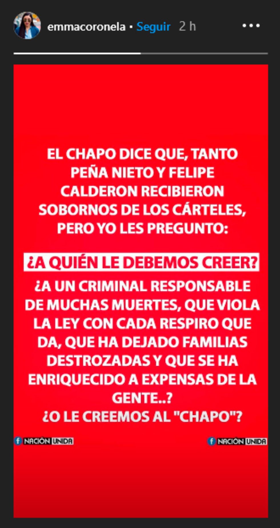 En una historia de su supuesta cuenta de Instagram, Emma Coronel compartió una imagen del portal Nación Unida, en la que se hace una fuerte acusación contra Peña y Calderón, a quienes tacha de verdaderos criminales, a la vez que defiende a El Chapo.