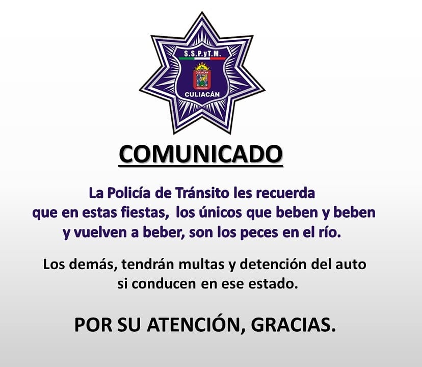 … en estas fiestas, los únicos que beben y beben y vuelven a beber son los peces en el río. Los demás, tendrán multas y detención del auto si conducen en este estado”, destacó la dependencia en una publicación a través de su cuenta oficial de Facebook.