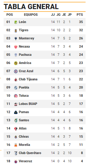 Así 13 equipos se disputarán en las siguientes tres jornadas los seis cupos que quedan, luego de que León y Tigres amarraron su clasificación en esta Jornada 14. De momento, Monterrey, Necaxa, Pachuca, América, Cruz Azul y Tijuana ocupan los lugares de Liguilla y prácticamente dependen de sí mismos para mantenerlo así, aunque en estas tres jornadas todo podría cambiar.