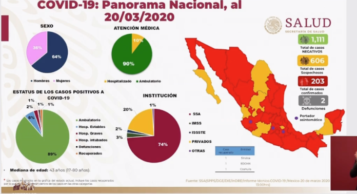 Esta cifra representa un aumento de 39 nuevos casos, ya que anoche eran 164. Además, confirmó la segunda muerte por coronavirus en el país: se trata de un paciente, adulto mayor, originario de Durango.