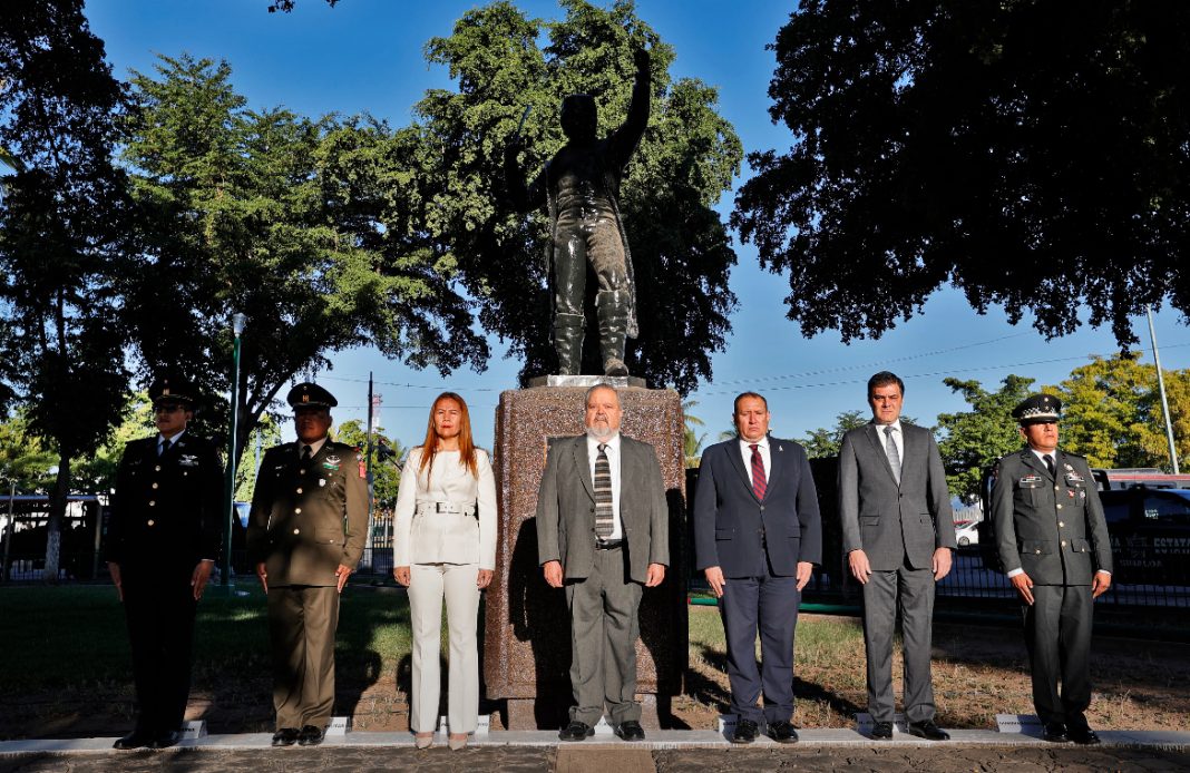 Posteriormente, las autoridades, se trasladaron a la plazuela Álvaro Obregón, a un costado de la Catedral de la capital sinaloense, para montar una guardia de honor en el monumento al General Antonio Rosales, quien acompañado de sus soldados mexicanos derrotó al Ejército Francés en la Batalla de San Pedro en el año de 1864.