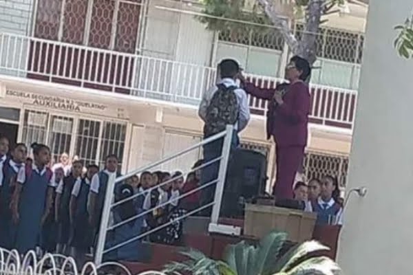 SANTA CATARINA, NL.- En redes sociales se ha viralizado una imagen en la que se puede apreciar a una maestra cortándole el cabello a un alumno de una secundaria, frente a todo el plantel escolar, esto presuntamente como castigo al no haber cumplido con el reglamento.