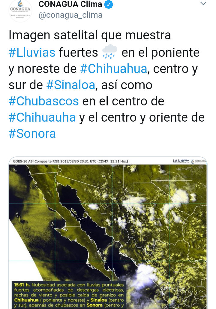 CIUDAD DE MÉXICO.- En las próximas tres horas, se pronostican lluvias puntuales fuertes en Sonora (oriente, occidente y centro), Chihuahua (mayor parte), Coahuila (occidente, centro y oriente), Nuevo León (occidente y sur), Sinaloa (centro y sur), Durango (occidente), Nayarit (mayor parte), Jalisco (occidente y oriente).