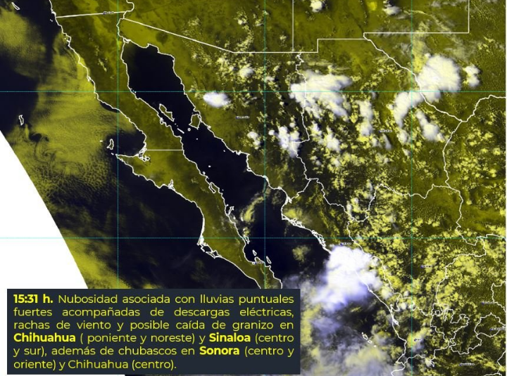 CIUDAD DE MÉXICO.- En las próximas tres horas, se pronostican lluvias puntuales fuertes en Sonora (oriente, occidente y centro), Chihuahua (mayor parte), Coahuila (occidente, centro y oriente), Nuevo León (occidente y sur), Sinaloa (centro y sur), Durango (occidente), Nayarit (mayor parte), Jalisco (occidente y oriente).