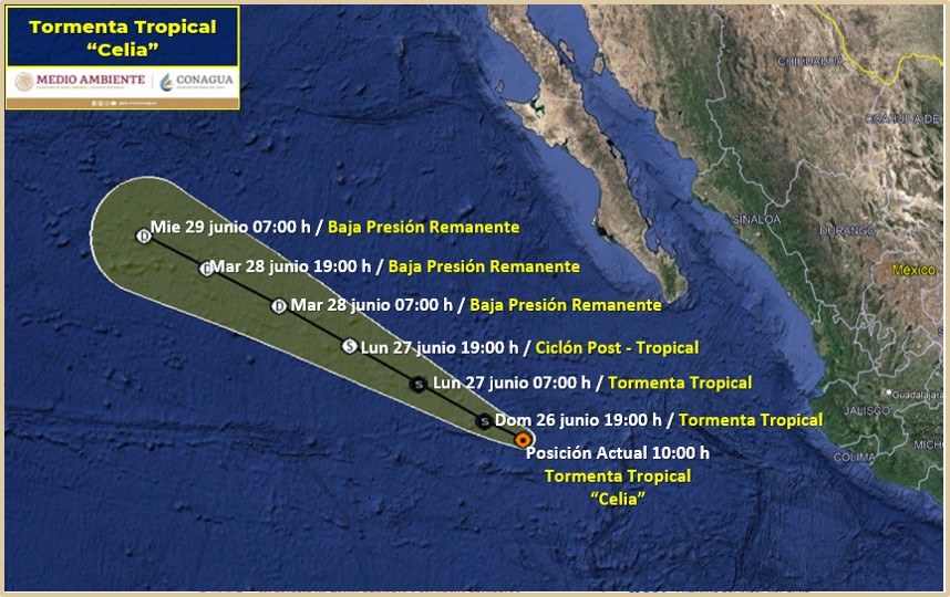La tormenta tropical “Celia” al suroeste de Baja California Sur, continuará alejandóse gradualmente de costas mexicanas.