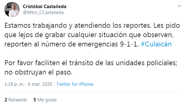 El secretario de Seguridad Pública de Sinaloa, Cristóbal Castañeda Camarillo, llamó a la ciudadanía a abrir paso a los vehículos de emergencia en la zona, aún sin dar detalles de lo sucedido.