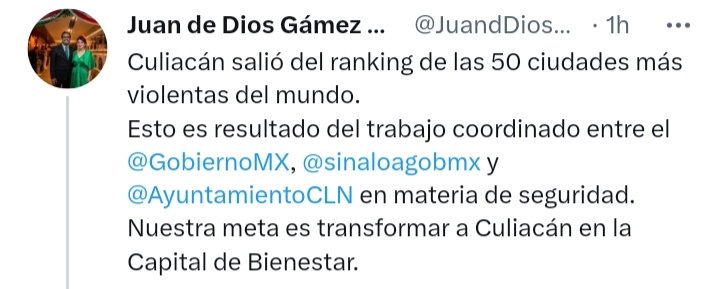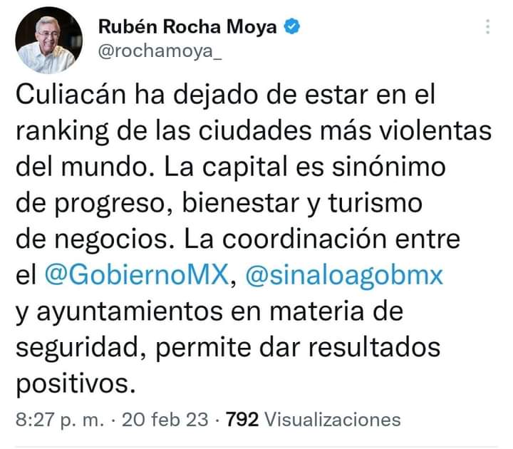 CULIACÁN, Sin.- Este lunes el gobernador Rubén Rocha Moya tuiteó que la ciudad de Culiacán está fuera de las urbes más violentas del mundo.