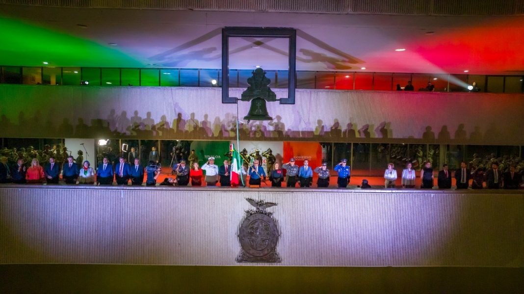 CULIACÁN, Sin.- El gobernador Rubén Rocha Moya conmemoró el 214 aniversario de la Independencia de México, y como cada año, encabezó el acto protocolario desde el balcón principal de Palacio de Gobierno para recordar y vitorear a los héroes que nos dieron patria y libertad, para enseguida repicar la gigantesca campana que luce en el balcón.