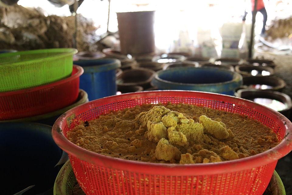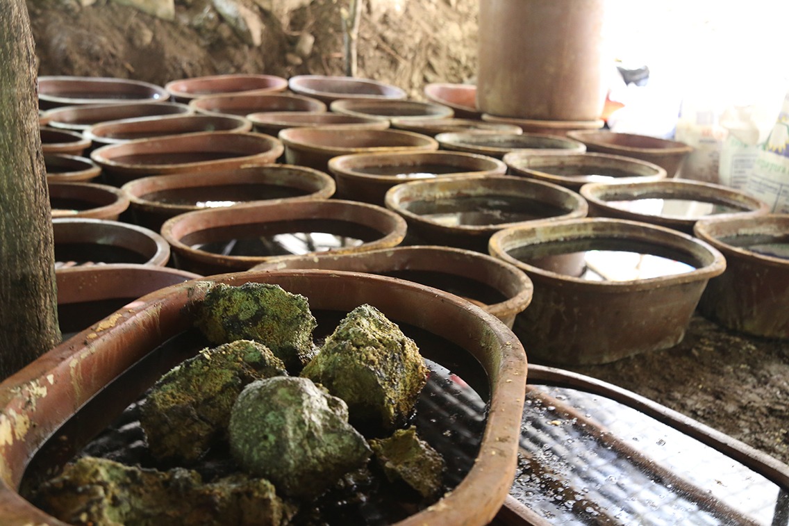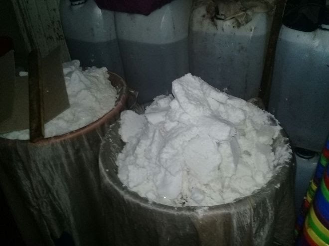 También 12 tinas de 400 litros cada una y en su interior sumergidos en agua 12 tambos de 100 litros; 2 reactores metálicos con destiladores; 2 tinas de 50 litros; 90 costales con sustancia sólida granulosa; y seis cubetas conteniendo una sustancia química color café.