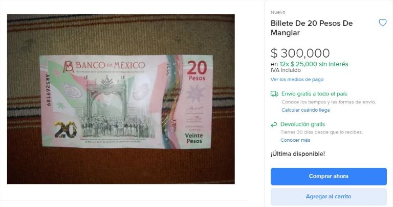 CIUDAD DE MÉXICO.- Un usuario de Mercadolibre está vendiendo un billete donde se representa la consumación del proceso histórico de la Independencia de México, el cual pertenece pertenece a la familia G, ejemplar que se vende en hasta 300 mil pesos, o bien, dan 12 pagos de 25 mil pesos cada uno.