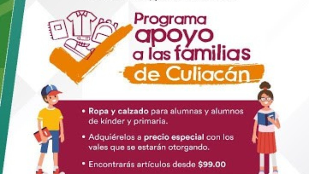 CULIACÁN, Sin.- El sistema DIF Culiacán y en alianza con la empresa Calzzapato, ponen en marcha el programa “Apoyo a las Familias de Culiacán”, mediante el cual se proveerá́ a precio especial con vales de descuento, ropa y calzado para niños y niñas que se encuentren cursando estudios de educación preescolar y primaria.