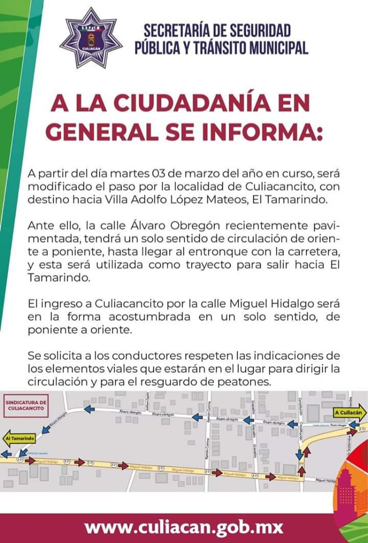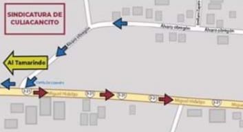 CULIACÁN, Sin.- Desde este martes la dirección de Tránsito municipal cambio el sentido a la calle que conduce de Culiacancito de Villa Adolfo López Mateos “El Tamarindo”, a la altura de Culiacancito.