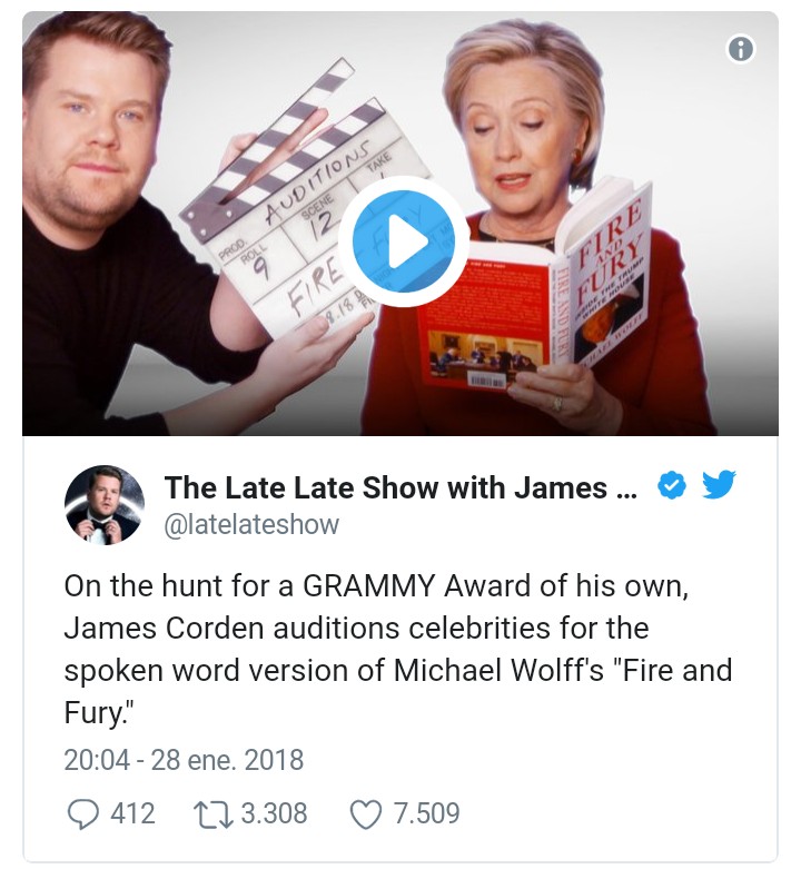 La excandidata presidencial formó parte de una parodia junto a James Corden en la que realizó una audición a varias celebridades para la grabación del audio libro “Fire and Fury. Inside the Trump White House” de Michael Wolff.