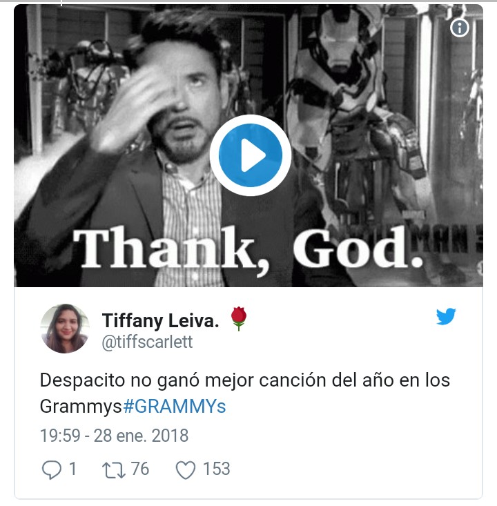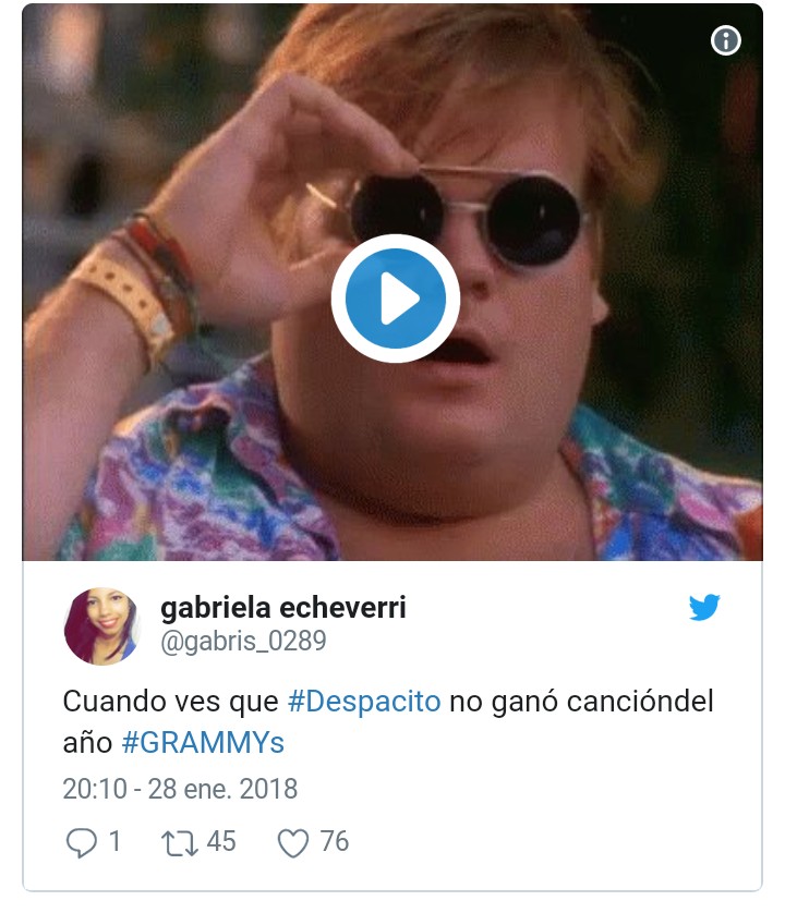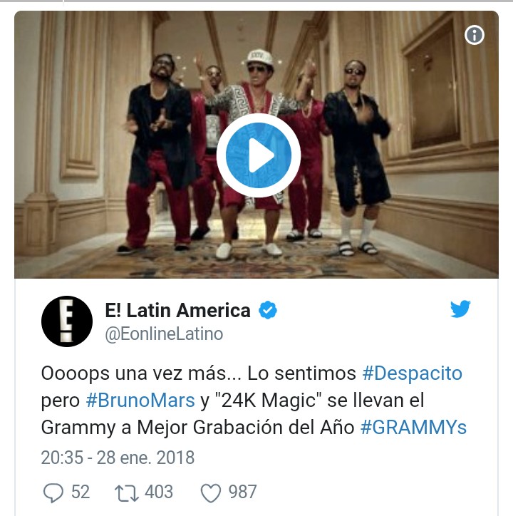 El pegajoso tema estuvo nominado a dos categorías, “Canción del año” y “grabación del año” pero ambas les fueron arrebatadas por el cantante Bruno Mars, lo que ocasionó burlas y lluvia de memes en Twitter.
