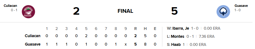 Guasave volvió a tocar la serpentina de Aldo Montes en la segunda entrada, ya que Jared Carr abrió con doblete el episodio, después avanzó a tercera con rola a la antesala de Orlando Piña, para que Alan Espinoza se trajera al plato a Carr con globo de sacrificio al prado izquierdo y así poner 2-0 el marcador.