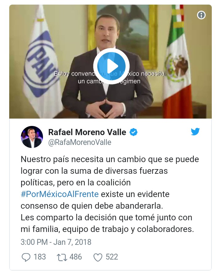 CIUDAD DE MÉXICO.- “Es evidente que existe un consenso a favor de quien debe ser el abanderado”, así comenzó el video en el que el panista Rafael Moreno Valle anunció este domingo que declina a favor de Ricardo Anaya rumbo a las elecciones presidenciales de 2018.