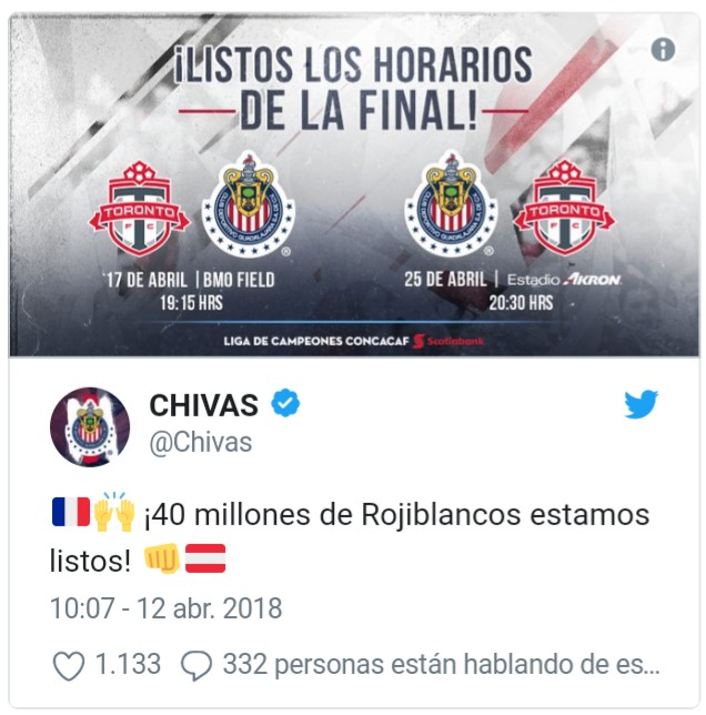 La final de vuelta donde se conocerá al campeón y al representante de la Concacaf en el Mundial de Clubes 2018 se jugará el 25 de abril en el Akron a las 20:30 horas.
