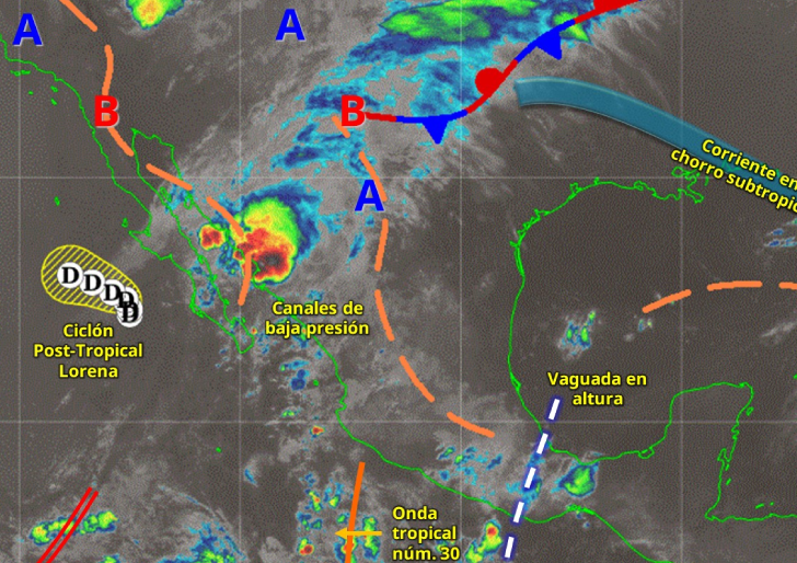 CIUDAD DE MÉXICO.- Los desprendimientos nubosos de Lorena continuarán interactuando con el monzón mexicano, originando lluvias fuertes a muy fuertes en Baja California, Baja California Sur, Chihuahua y Nayarit; además de lluvias puntuales intensas en Sonora, Durango y Sinaloa.