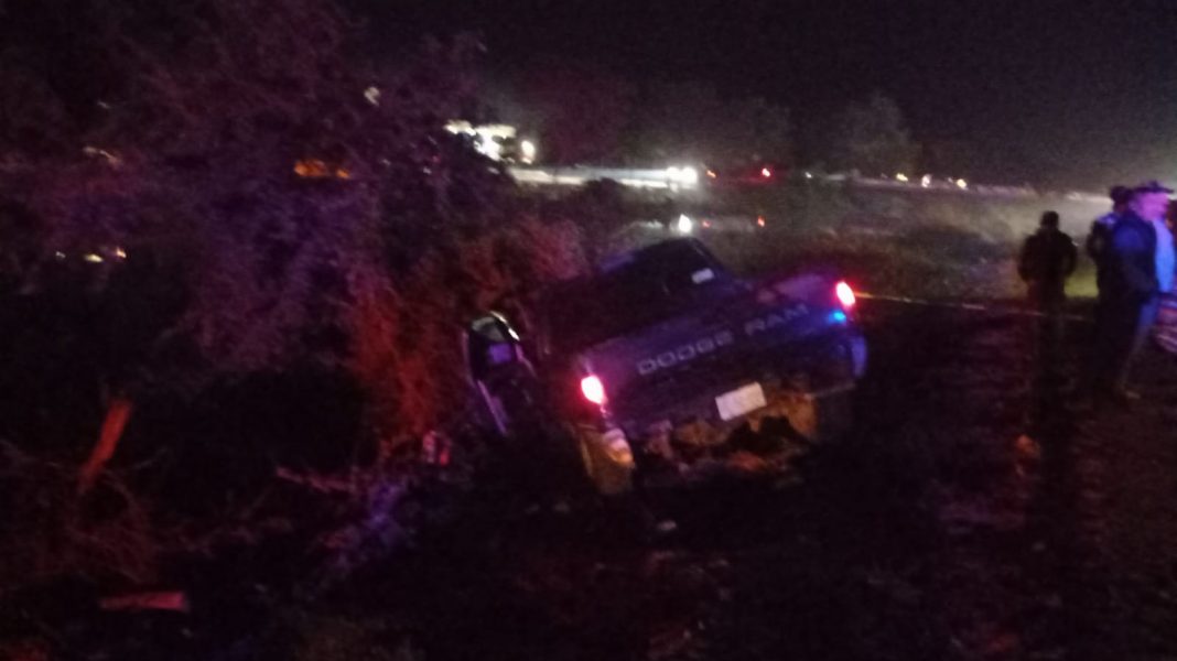 La motocicleta quedó debajo de la camioneta. Habría participado en el accidente otro vehículo, un sedán que registró impacto frontal, mientras la camioneta quedó casi a la deriva en un canal.