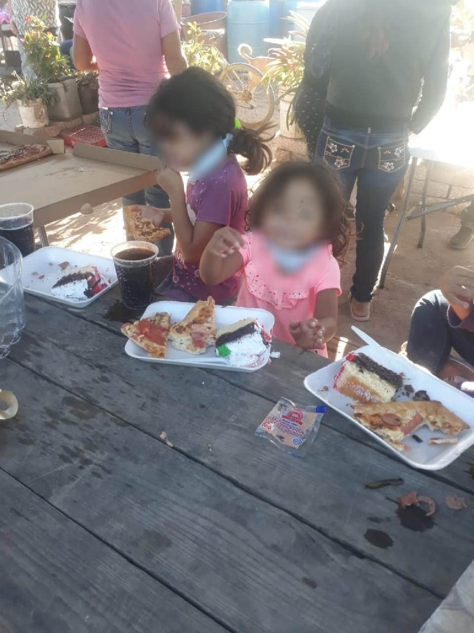 Grande fue el asombro de ver llegar a la patrulla, ya que no habían hecho ningún reporte de algún delito, sin embargo, los ojos de asombro cambiaron a brillo de alegría, al ver a los policías que traían para ellos juguetes, pizza, pasteles y ropa.