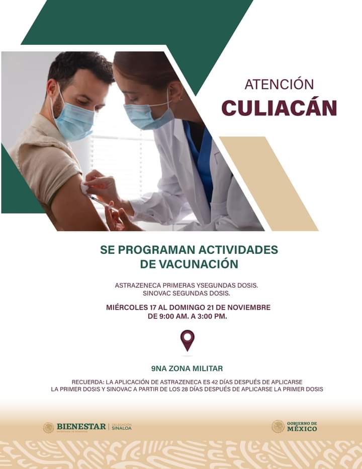 CULIACÁN, Sin.- Se inicia a partir del miércoles 17 al 21 de noviembre, un punto fijo de vacunación en la 9na Zona Militar, para primeras y segundas dosis AstraZeneca y segundas dosis Sinovac.