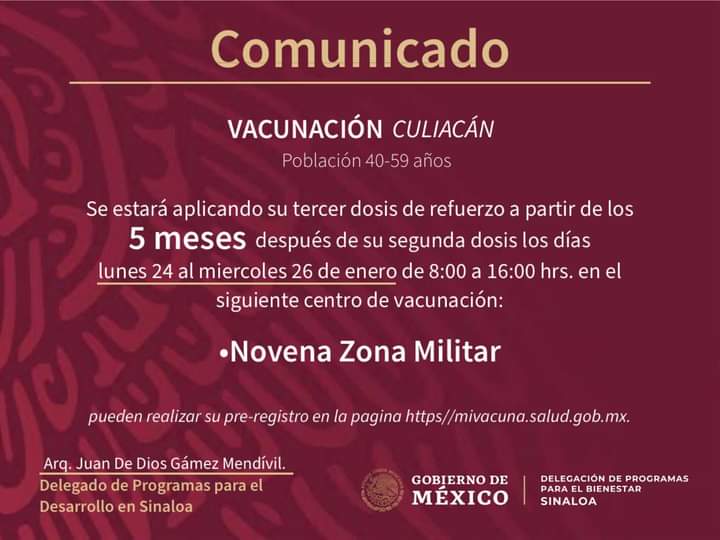 CULIACÁN, Sin.- Se estará aplicando su tercera dosis de refuerzo a partir de los 5 meses después de su segunda dosis los días 24, 25 y 26 de enero para los de 40 a 59 años de edad.