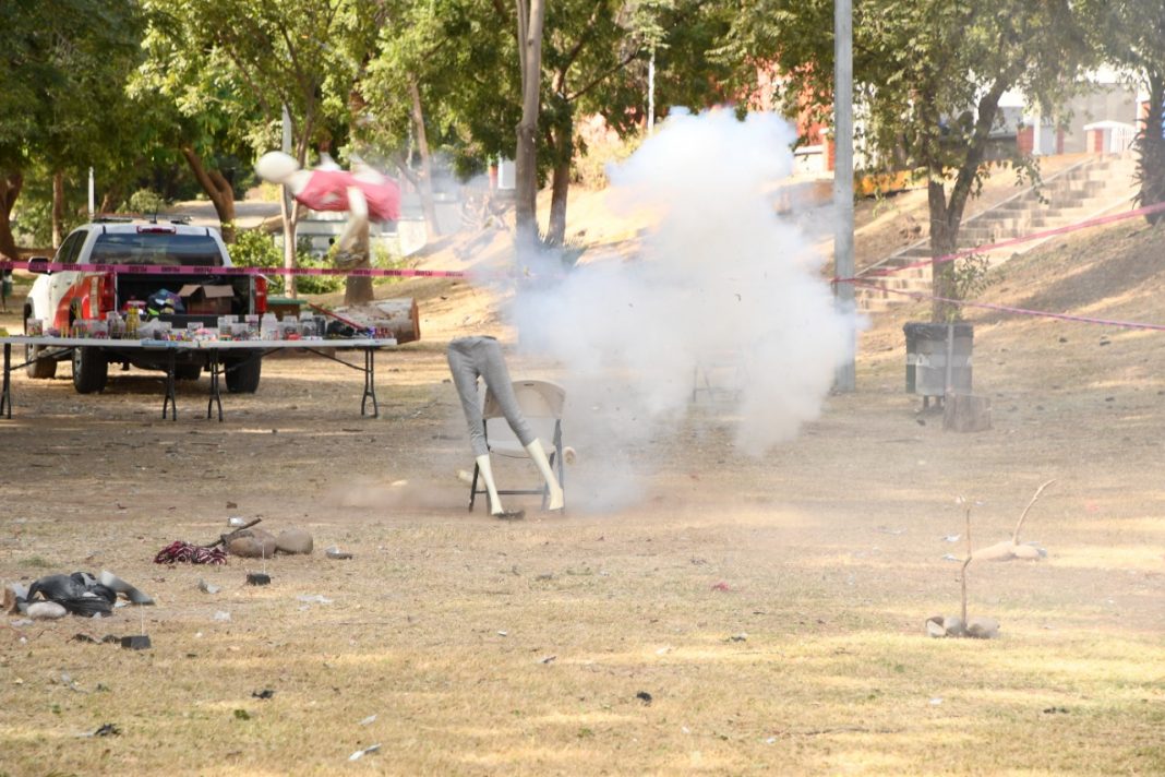 CULIACÁN, Sin.- Los efectos de una detonación por manipulación de pirotecnia pueden ser causantes de la pérdida de extremidades del cuerpo, quemaduras y hasta la muerte en niños y adultos, así quedó evidenciado durante la demostración de estos artefactos en el Parque Las Riberas a través del uso de maniquíes realizada por la Coordinación Municipal de Protección Civil.