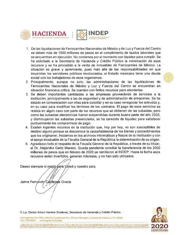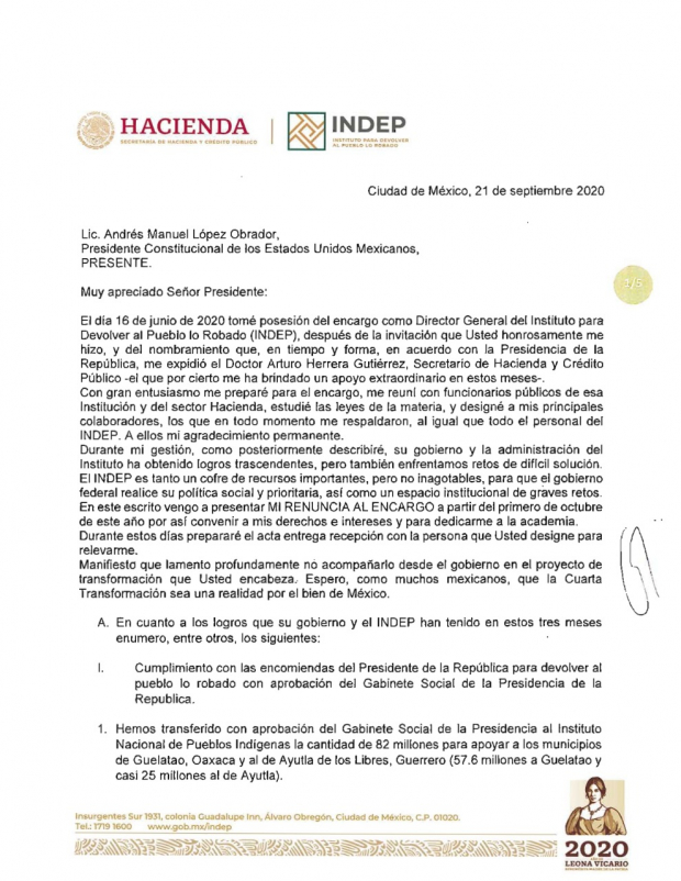 CIUDAD DE MÉXICO.- En su carta de renuncia al Instituto Nacional para Devolver al Pueblo lo Robado (Indep), Jaime Cárdenas informó que durante gestión encontró actos de corrupción por parte del personal.