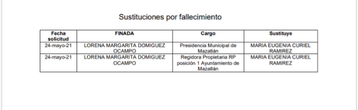 El día 24 de mayo del presente año, se tuvo por recibida la solicitud de registro de candidatura por parte del Partido Redes Sociales Progresistas, presentada por Rosa Elvira Ceballos Rivera, funcionaria partidista autorizada, designando a María Eugenia Curiel Ramírez, como candidata a la Presidencia Municipal del Ayuntamiento de Mazatlán, así como, candidata a regidora propietaria de representación  proporcional en la primera posición en virtud del fallecimiento  de la ciudadana Lorena Margarita Domínguez Ocampo.