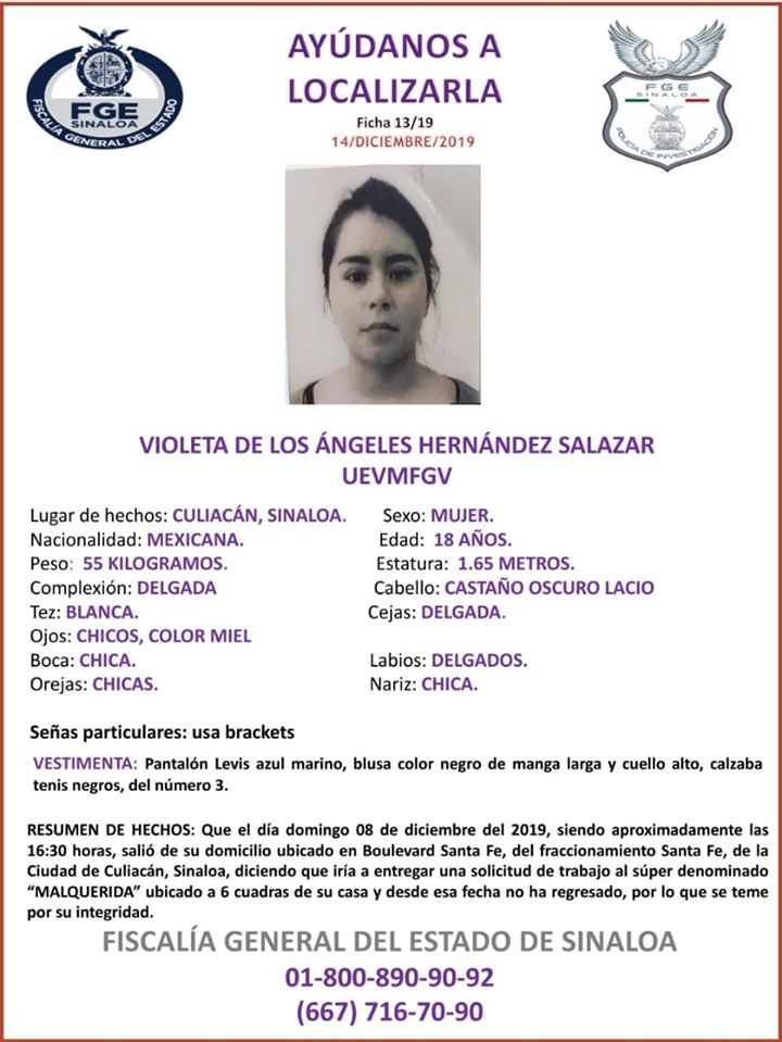 Su nombre: Violeta de los Ángeles de 18 años de edad, según una ficha de alerta emitida esta tarde por la Fiscalía General del Estado.
