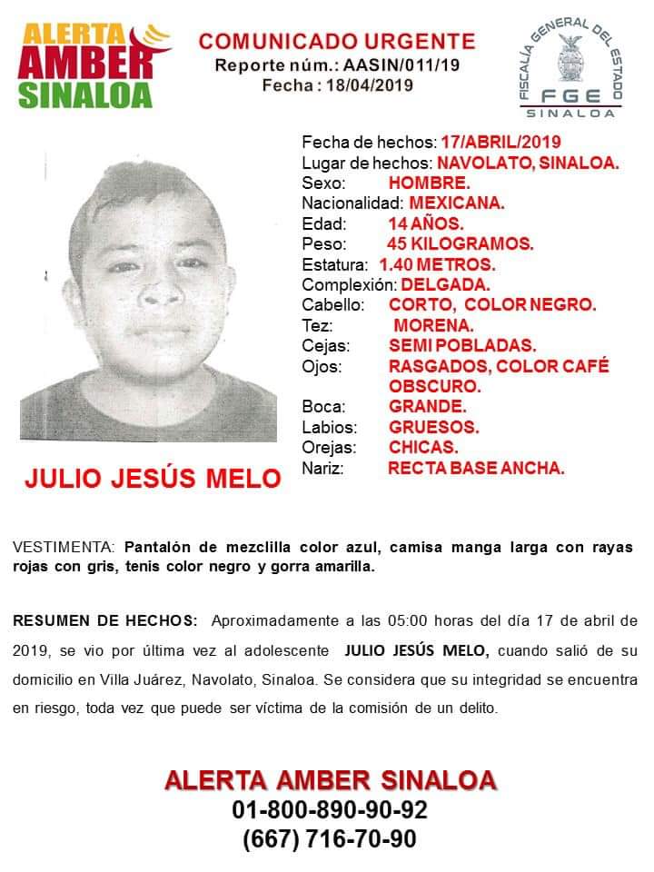 CULIACÁN, Sin.- Julio Jesús Melo de 14 años de edad desapareció la tarde de ayer al salir de su casa en Villa Juárez, Navolato. Esta tarde la Fiscalía General del Estado emitió la alerta Ámber para su localización.