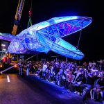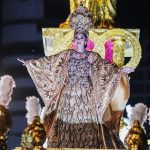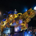 El siguiente carro fue “Entre Corceles e Hipopótamos”, una creación del reconocido diseñador Henry Wilson. El carro presenta corceles que parecen galopar junto al mar. La energía y la dinámica del carro capturaron la atención del público.