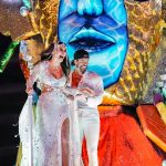 “Fiesta en el Puerto”, diseñado por Henry Wilson, que presenta arlequines y mascaritas gigantes. Los tripulantes son miembros del Ballet Reyes García.
