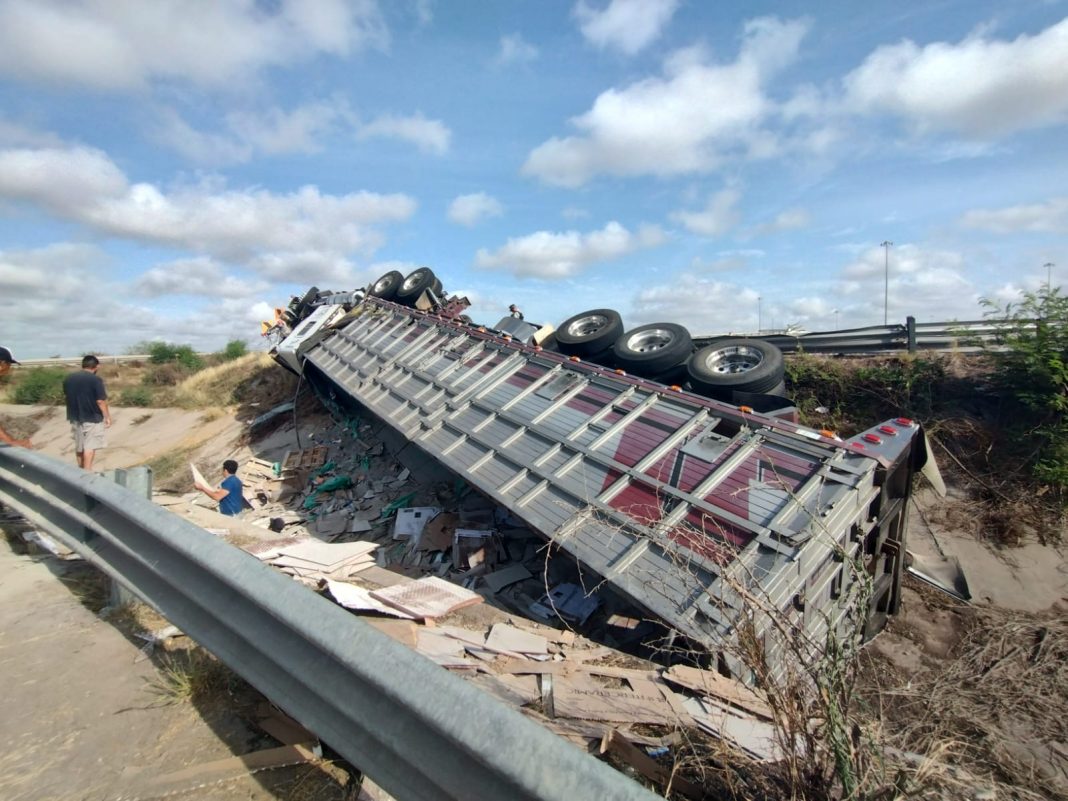 Cargado de vitropiso se voltea en El Trébol; pierde el control del volante y termina volcando sobre el lado izquierdo de la unidad