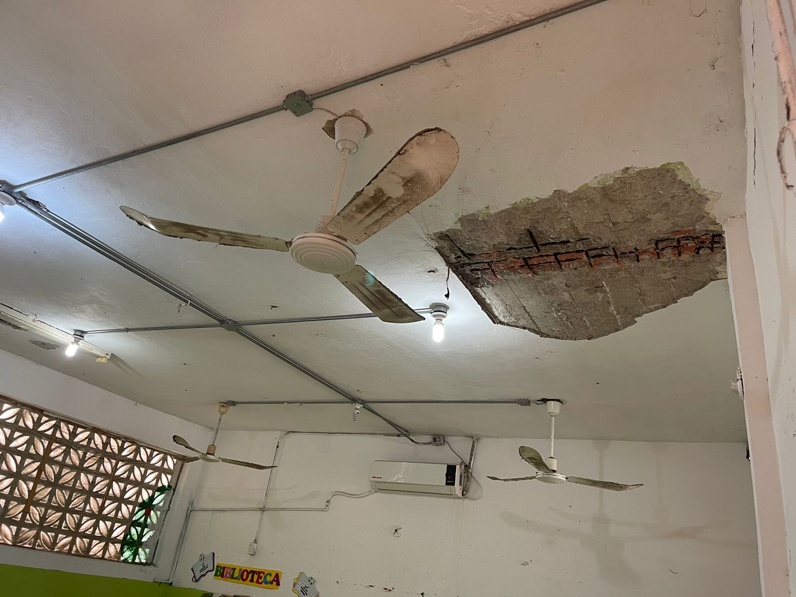 Los padres exponen que la escuela tiene los techos dañados, falta de aires acondicionados, ventiladores, cableado eléctrico y mala condición de los baños, por lo que el “Químico” Benítez giró instrucciones a las áreas de Bienestar Social, Protección Civil, Jumapam y Obras Públicas para una pronta atención de la situación.