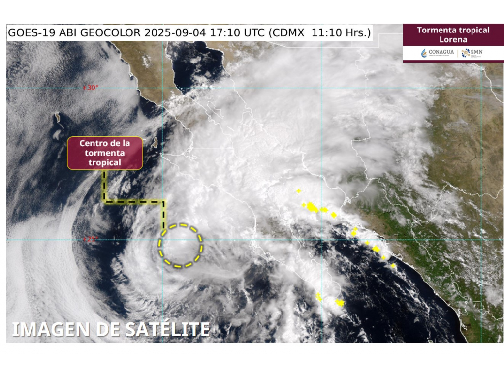 El ciclón tropical Lorena, se localizará frente a la costa occidental de Baja California Sur, y en interacción con el monzón mexicano, mantendrá lluvias puntuales torrenciales en Baja California Sur; puntuales intensas en Sinaloa, Sonora y sur de Baja California.