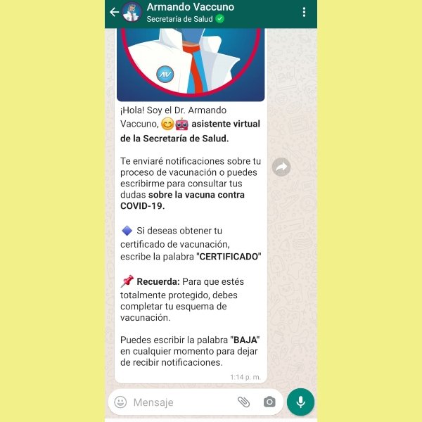 Después de obtener tu certificado de vacunación, para ya no recibir más mensajes de Armando Vaccuno solo tienes que mandarle la palabra “Baja” y listo.