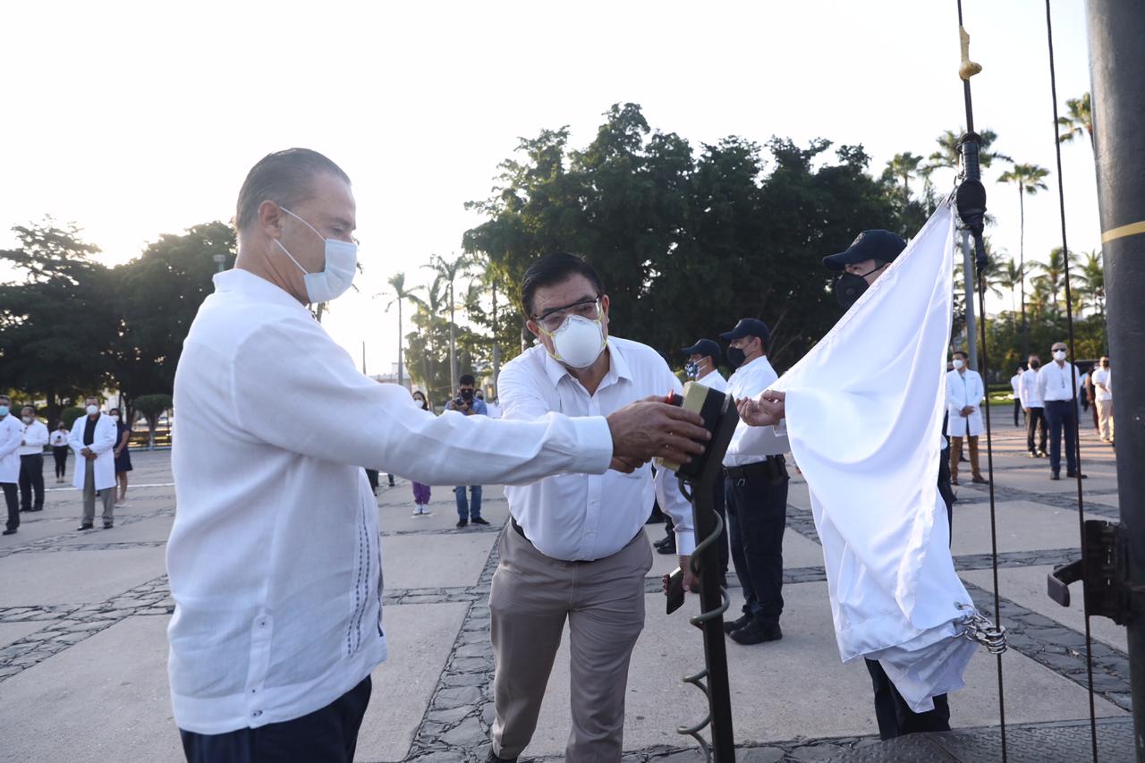 El gobernador Quirino Ordaz Coppel encabezó una sentida ceremonia en la explanada de Palacio de Gobierno donde izó a toda asta una bandera blanca, en el marco del Día del Médico que en todo México se conmemora cada 23 de octubre desde 1937.