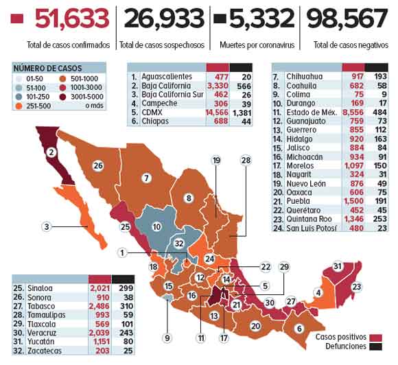 Existen 2 mil 414 casos nuevos, con lo que el acumulado ascendió a 51 mil 633 confirmados, de los cuales, 11 mil 300 son casos activos que se ubican, principalmente en la Ciudad de México, Estado de México y Tabasco.