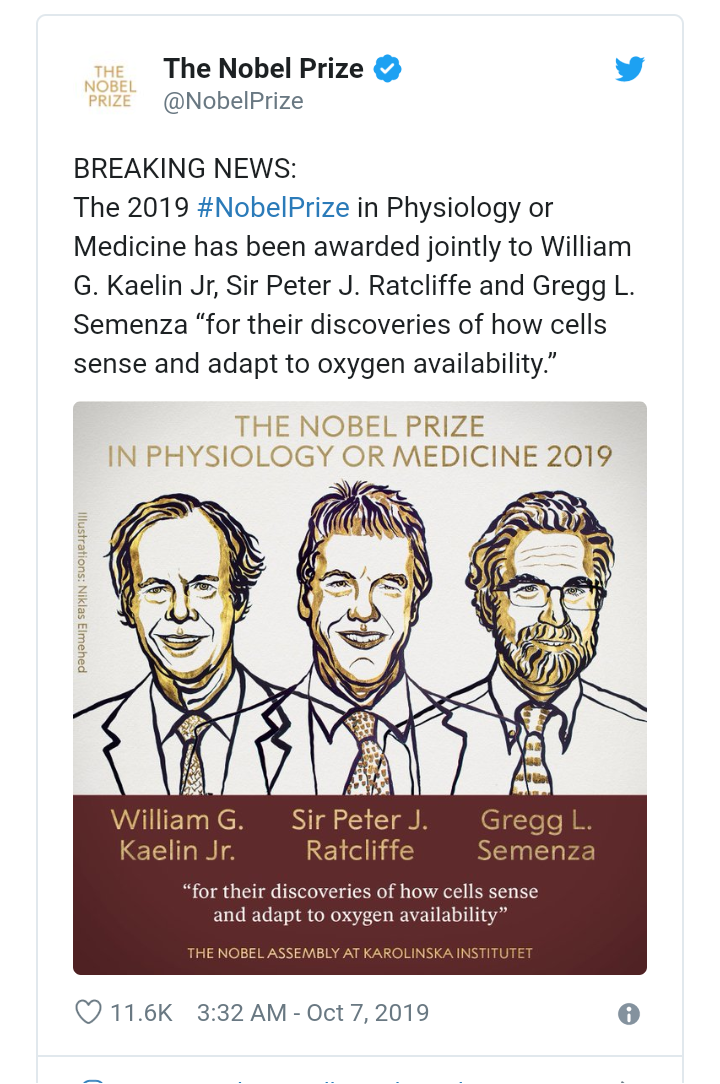 El premio Nobel de Medicina 2019 es para los investigadores William G. Kaelin Jr, Sir Peter J. Ratcliffe and Gregg L. Semenza “por sus descubrimientos sobre cómo las células perciben y se adaptan a la disponibilidad de oxígeno