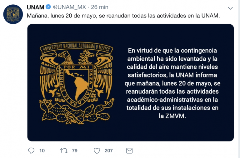 De la misma manera, la Universidad Nacional Autónoma de México anunció que también reanudará todas sus actividades a partir de mañana, lunes 20 de mayo.