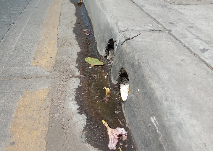 Con una ligera intermitencia el agua, que sale de un ducto a pie de banqueta, desfila calle a abajo rumbo al malecón, sin determinarse de dónde sale el líquido.