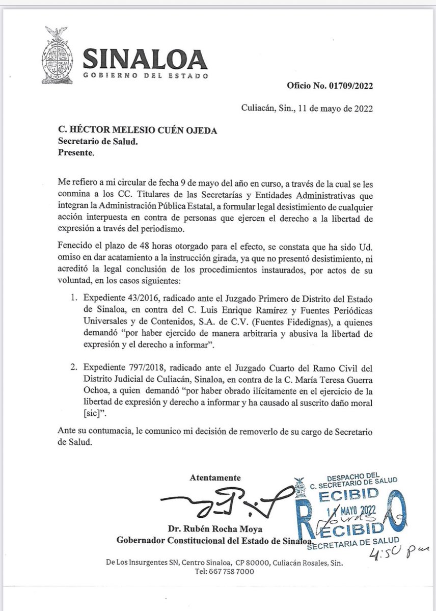 El cumplimiento de la destitución, argumentó el gobernador Rubén Rocha Moya, es con base en el no desistimiento de Cuén en retirar las demandas contra los periodistas Luis Enrique Ramírez Ramos y la hoy secretaria de las Mujeres, Teresa Guerra.