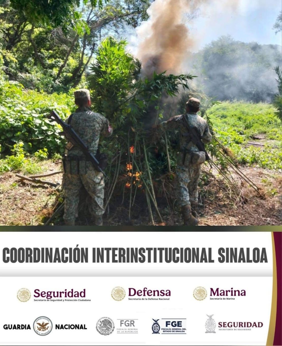 CULIACÁN, Sin.- Elementos del Ejército Mexicano, en coordinación con la Guardia Nacional, la Secretaría de Marina, la Secretaría de Seguridad y Protección Ciudadana, la Fiscalía General de la República, la Fiscalía General del Estado y la Secretaría de Seguridad Pública de Sinaloa, a través de la Policía Estatal Preventiva, aseguraron siete áreas de concentración de sustancias químicas y un plantío de marihuana en los municipios de Culiacán y Cosalá.