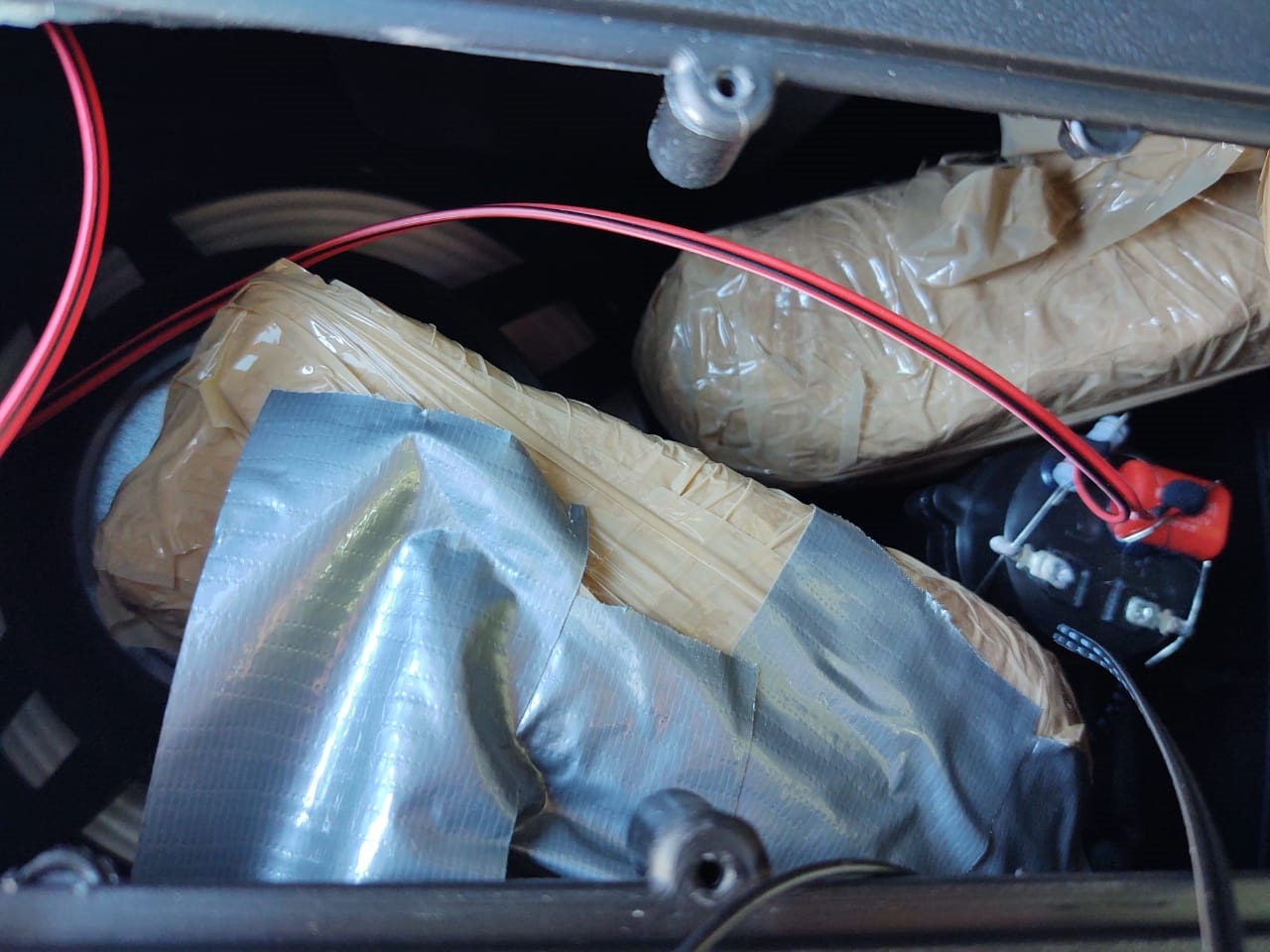 Al abrir la caja de cartón, integrantes de la institución localizaron una bocina que ocultaba dos envoltorios confeccionados con cinta canela, con una sustancia blanca y cristalina con las características propias del narcótico conocido como crystal.