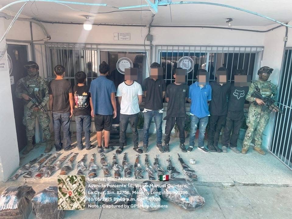 Lo anterior se llevó a cabo durante recorrido de inteligencia terrestre en el poblado La Cruz, municipio de Elota, donde personal naval realizó la detención de nueve presuntos trasgresores de la ley, un vehículo, 15 armas largas, 96 cargadores y 283 cartuchos de diferentes calibres y 17 piezas de equipo táctico.
