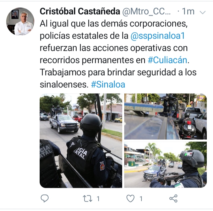 A través de Twitter el secretario de Seguridad Pública de Sinaloa, Cristóbal Castañeda Camarillo, indicó que al igual que las demás corporaciones, policías estatales refuerzan las acciones operativas con recorridos permanentes en Culiacán.