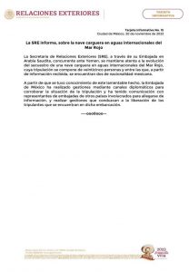 CIUDAD DE MÉXICO.- La Secretaría de Relaciones Exteriores (SRE) de México confirmó el secuestro de dos ciudadanos mexicanos a bordo de un buque carguero en aguas internacionales del Mar Rojo. La embarcación, identificada como el Galaxy Leader con bandera de Bahamas, fue abordada por rebeldes hutíes del Yemen, quienes tomaron como rehenes a un total de 25 tripulantes.