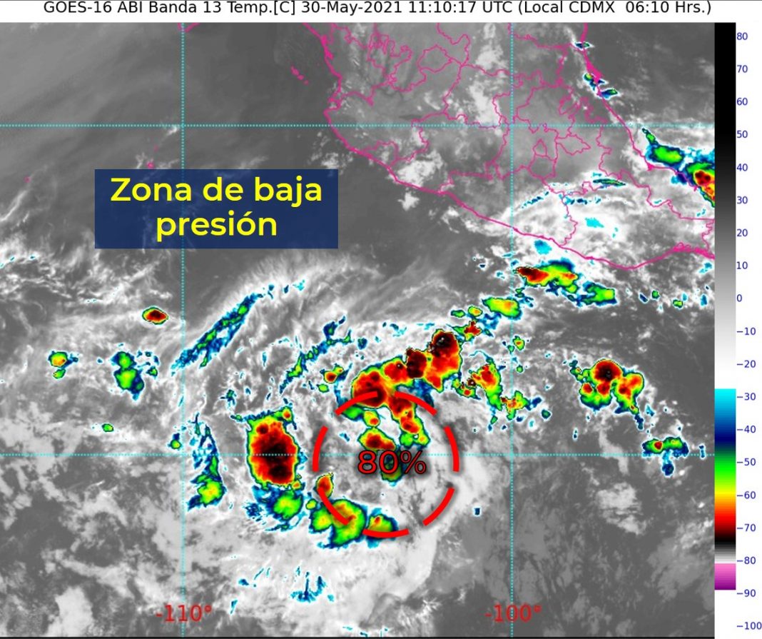 CIUDAD DE MÉXICO.- La zona de baja presión ahora con 80% su probabilidad para desarrollo ciclónico en 48 horas y se localiza al sur-suroeste de las costas de Guerrero.
