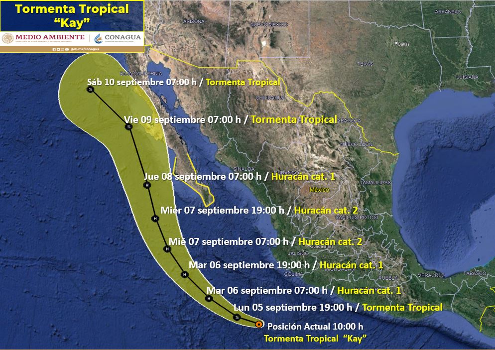 Las extensas bandas nubosas de la tormenta tropical Kay originarán lluvias torrenciales (de 150 a 250 milímetros) en zonas de Nayarit y Sinaloa, intensas (de 75 a 150 milímetros) en regiones de Colima, Jalisco y Michoacán, muy fuertes (de 50 a 75 milímetros) en localidades de Guerrero.